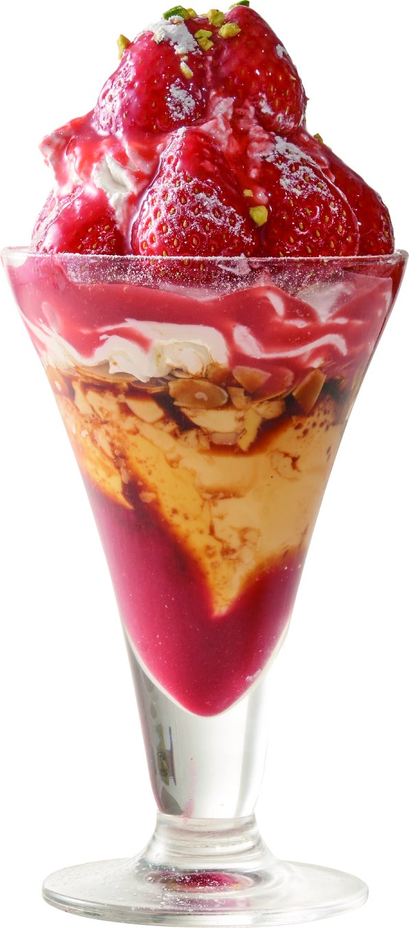 たっぷりの苺をトッピングした贅沢なプリンパフェ