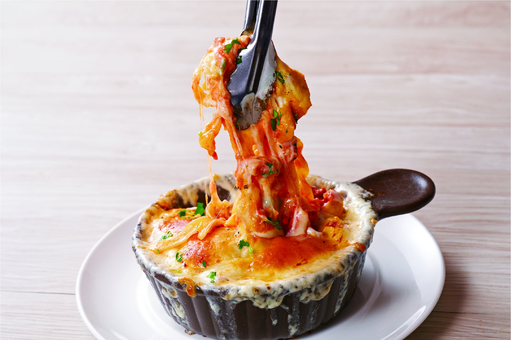 たっぷりチーズとトマトソースが絡んだ熱々のクリーミーグラタンパスタ