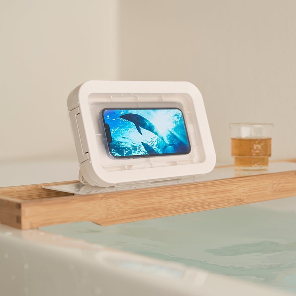 おふろでスマホ、くつろぎの防水ケース「MAGCASE S」おふろなど水回りで映画や音楽などをスマートフォンで満喫できる、マグネット・スタンド付きのスマートフォン専用防水ケースです。マグネットでユニットバスの壁に貼り付けたり、スタンドでおふろのふたに置いたりとさまざまな視聴、操作スタイルに対応します。水回りで安心してスマートフォンを楽しめる「MAGCASE S」でくつろぎのおふろ時間をお過ごしください。