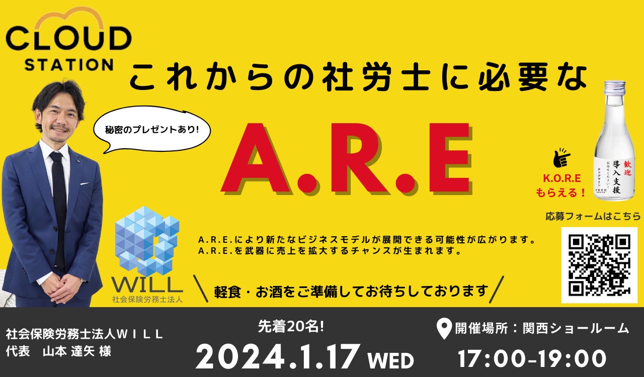 人事労務分野のシステム活用・導入支援を手掛ける株式会社TECO Design(本社:福岡県福岡市、代表取締役社長 : 杉野 愼)は、同社が運営するショールームCLOUD STATIONにて、ショールーム来館限定イベント「これからの社労士に必要なA.R.E」を2024年1月17日(水)大阪にて開催致します。
