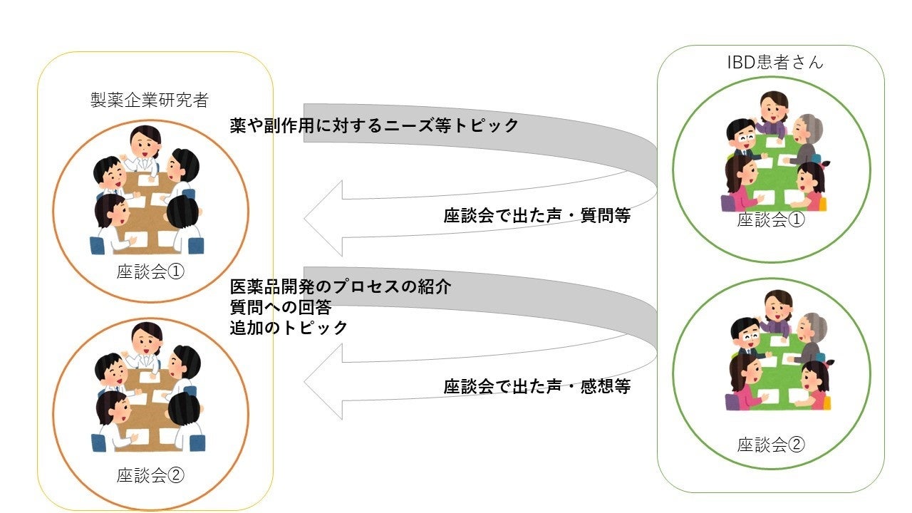 そこで、今回は、Patient Centricityに関する新しい取り組みとして、Gコミュニティを運営するグッテスタッフがファシリテーター・情報の伝達役となり、IBD患者さんの座談会とその内容を踏まえた研究者の座談会を交互に行うことで、間接的に研究者と患者さんが意見交換を行う”間接的な座談会”を開催しました。今回得られたニーズ等を元に当社はWorld Caféと連携しながらPatient Centricityの取り組みを進めてまいります。