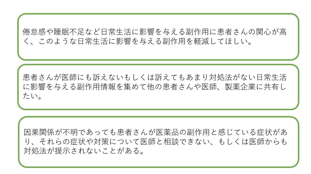 〇患者さんが医師にも訴えないもしくは訴えてもあまり対処法がない日常生活に影響を与える副作用情報を集めて他の患者さんや医師、製薬企業に共有したい。