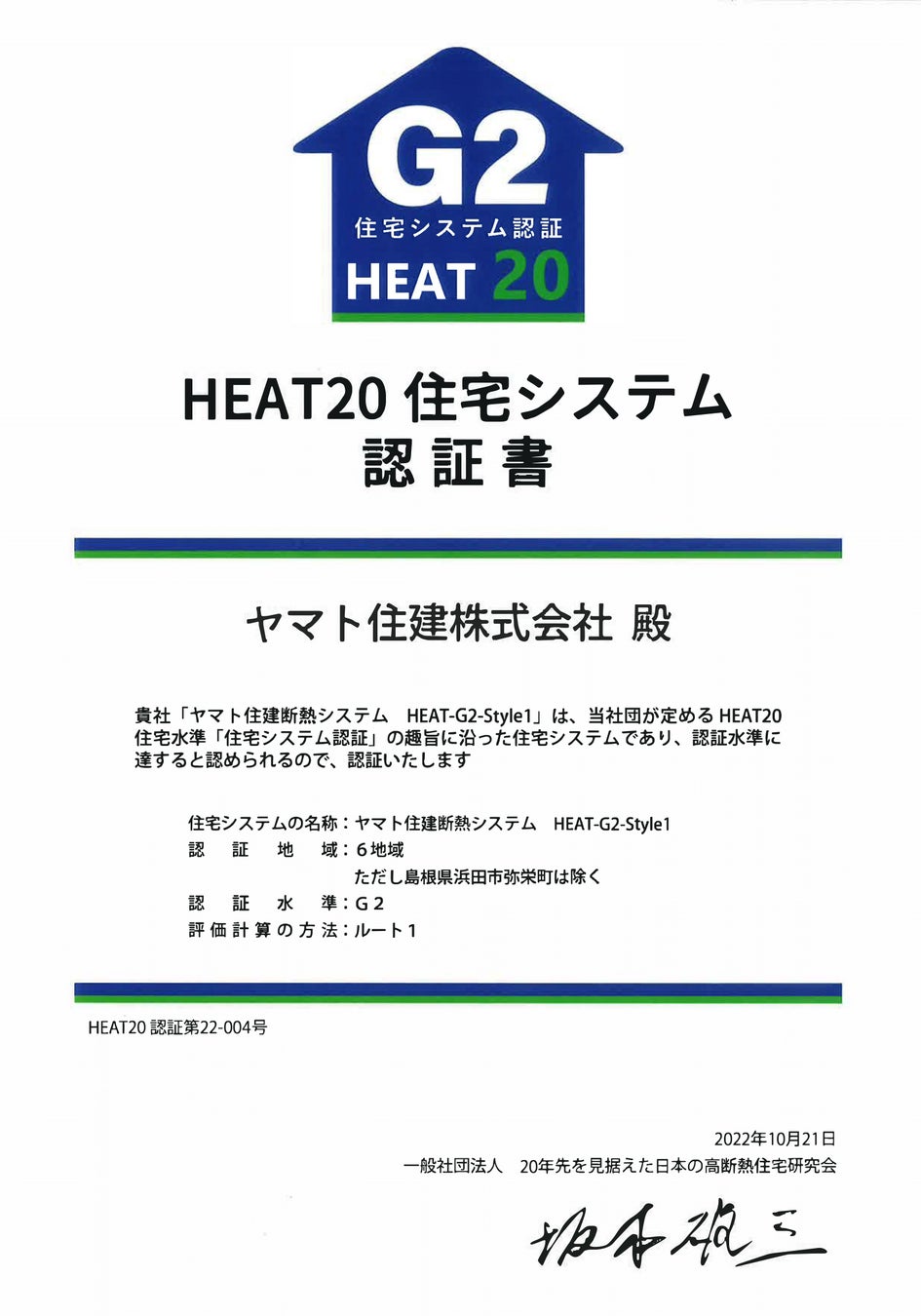 注文住宅のヤマト住建HEAT20認証システム「住宅システム認証」でG2認証を取得