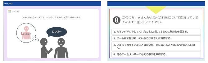 今回は、ライトワークスの汎用教材「LGBTQ・SOGIEに関する基礎知識」をベースとして、LGBTQ・SOGIEに関する基礎知識は汎用教材で学び、合わせて、自社で起こりうる事例を元にしたケーススタディやクイズの教材をオリジナルで制作し、同時に展開しました。