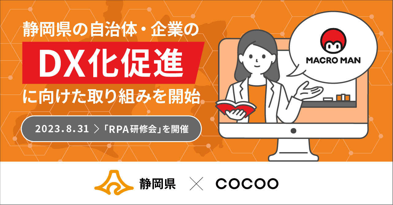 内容 | (1)経緯・概要説明(静岡県政策推進局総合政策課) (2)地方創生の取組紹介(コクー株式会社) (3)RPAツール「マクロマン」サービス説明(コクー株式会社) (4)RPAツール「マクロマン」自治体・民間活用事例紹介(コクー株式会社) (5)質疑応答 |