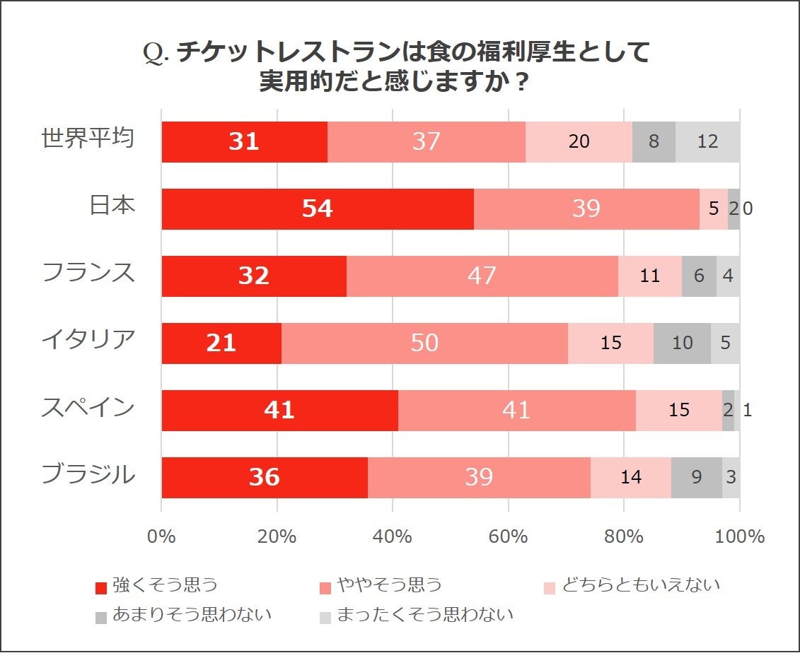 そのような中、日本のチケットレストラン利用者様の90%以上が「チケットレストランは実用的である」と回答されていることは必然的な結果と言えるかもしれません。実際に、当社が6月に発表した「ビジネスパーソンのランチ実態調査」では、ランチ代が400円まで低下していることが分かっています。直接的な食事支援につながり、手取り収入が増えるチケットレストランは、世界のビジネスパーソンよりもその実用性を実感しやすい状況にあったと考えられます。