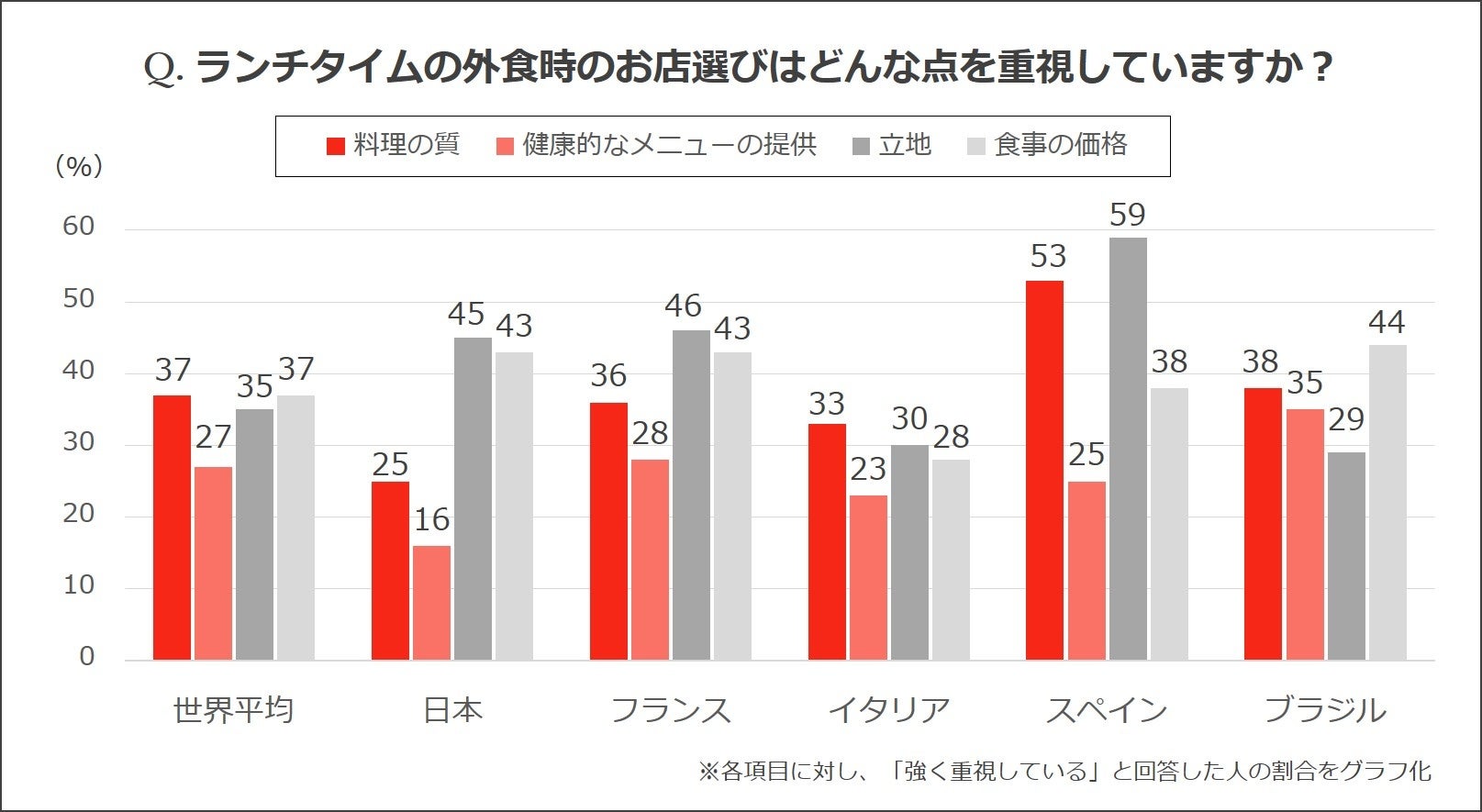 ◆ランチ選びの基準、日本は世界各国と比較し、料理の質や健康面を重視する人が少ない