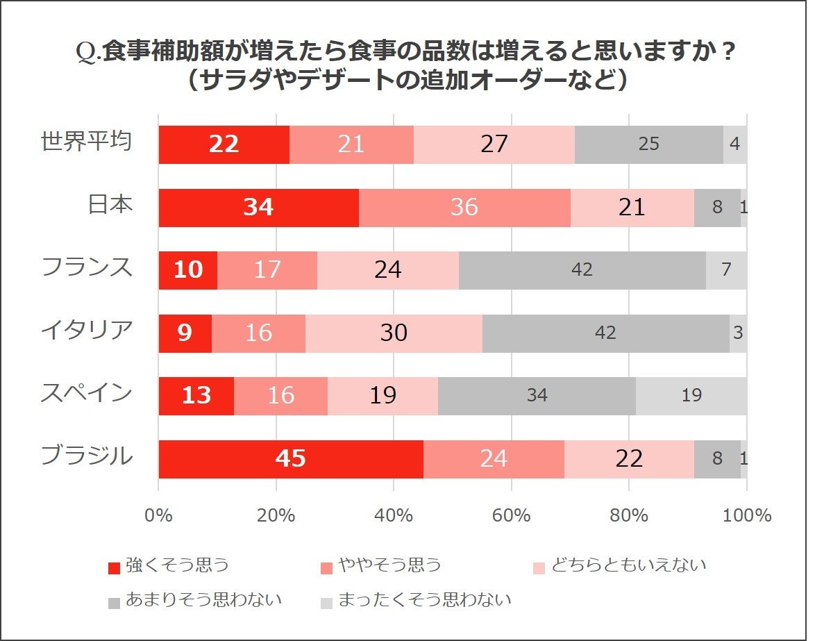 今回の調査対象であるチケットレストラン利用者にそのメリットについて聞いたところ、日本では「食の福利厚生として実用的である」と93%もの人が実感していることが分かりました。日本は、度重なる食料品の値上がりを経験し、食費の節約意識が高まる中で、手取り収入がダイレクトに増えるチケットレストランの有用性を強く感じている従業員が多くいるようです。また日本では、食事補助額が増えたらサラダなどを追加オーダーすると7割もの人が回答。実際、日本のランチ代平均は400円まで低下しており、食べたいものを我慢する人も多いことから食事の質の低下が危惧されています。日本の食事補助額は、約40年間一定で月額3,500円のままであるのに対し、食事補助が義務化されているフランスやイタリアではインフレに合わせ年々改定されており、日本の約4倍となる月額約13,500円。食事補助額が増えても品数を増やさない人が多いということは、現状の食事補助額で十分に食事摂れているという証でしょう。日本においてもインフレなどの市況変化に合わせ、柔軟に対応していくことが必要なのではないでしょうか。