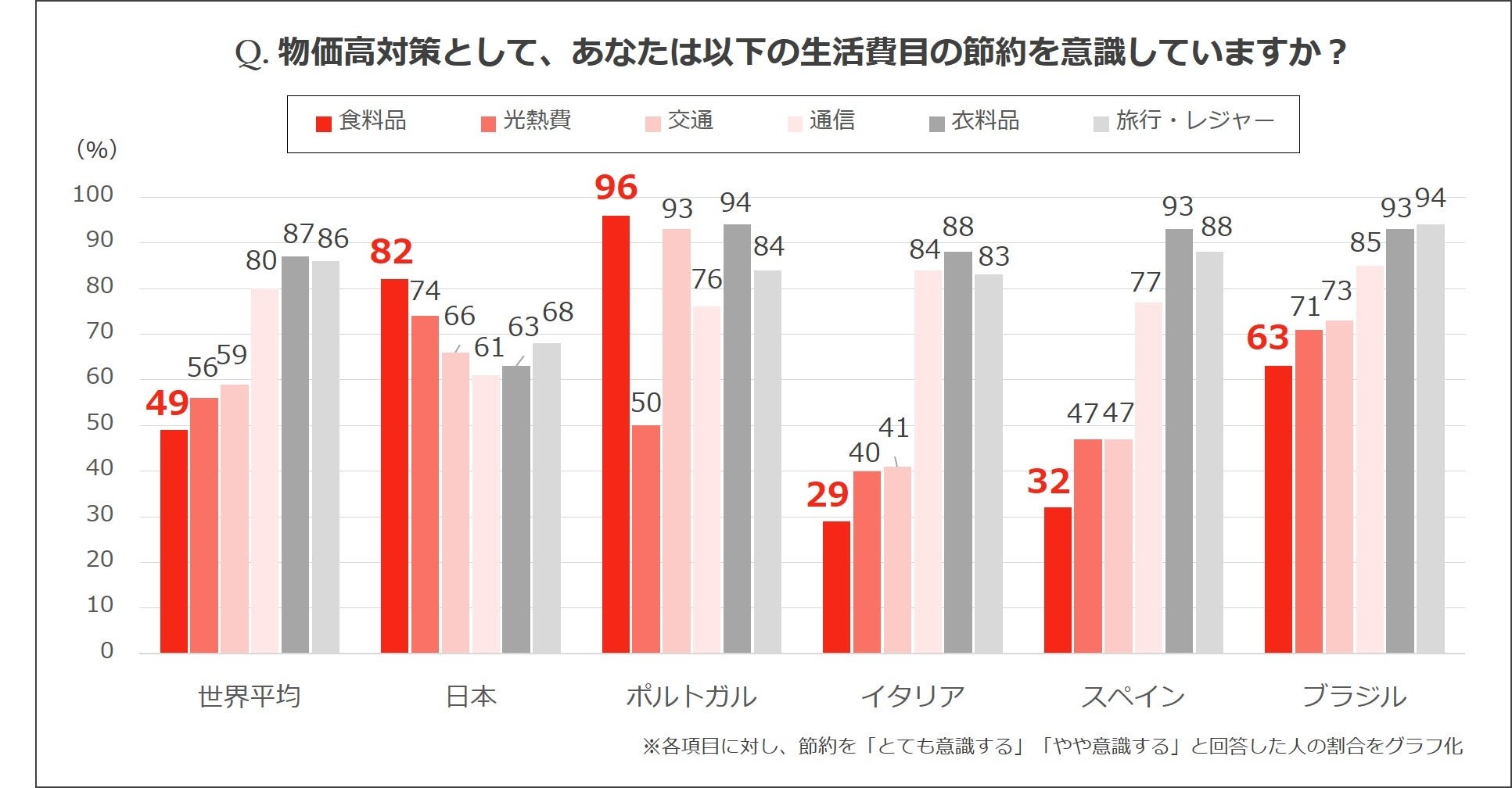 日本が節約を意識していると回答した割合が1番多かった費目が、「食料品(82%)」。各国と比較してもフランス、ポルトガルに次ぎ多くなっています。一方、世界平均をみると、衣料品(87%)、旅行・レジャー(86%)とおしゃれや娯楽に対する節約意識が高く、食料品(49%)、光熱費(56%)と生活に直結する費目への節約意識はさほど高くないことが分かりました。日本は、他国と異なり40年ぶりの物価高となり、生鮮食品を除く食料品のインフレ率は、未だ約9%と高い水準が続いています。その反動が食料品の節約意識に表れているのではないかと推察されます。