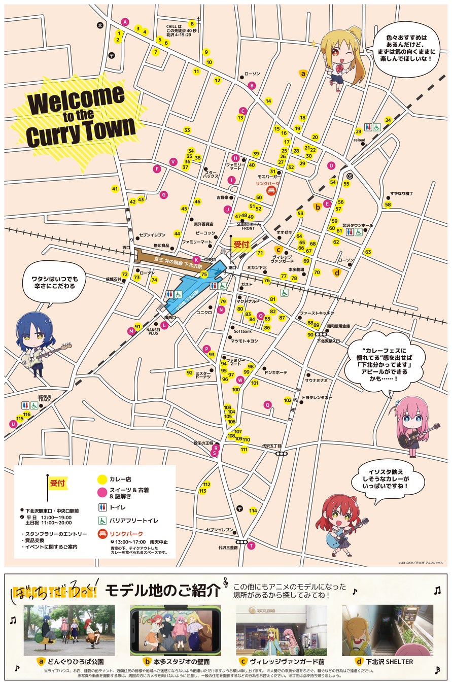 『ぼっち・ざ・ろっく!』とのコラボ企画を記念し、スタンプを集めてもらえる賞品では「結束バンド」の一員になったような気分になれるオリジナルピックや、下北沢カレーフェス✖︎『ぼっち・ざ・ろっく!』限定Tシャツがもらえます。また、アニメのモデルとなった場所をカレーマップで紹介していますので、カレーを食べながらモデル地をまわり『ぼっち・ざ・ろっく!』の世界観にたっぷり浸ることもできます。例年以上にパワーアップした下北沢カレーフェスにぜひ、お越しください。