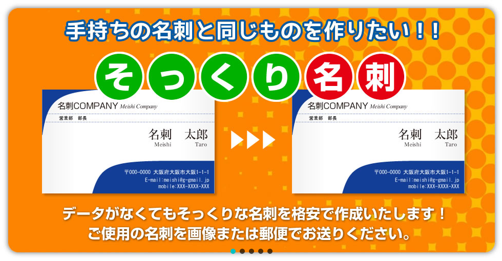 現在お持ちのお名刺をそっくりそのまま作成致します。 画像データやFAXで、現在お持ちのお名刺をお送りいただければ作成できます。 そっくりに作る事を目的とした名刺ですが、住所、メールアドレスなど文字部分に関しましては修正も可能ですので、お気軽にお申しつけください。