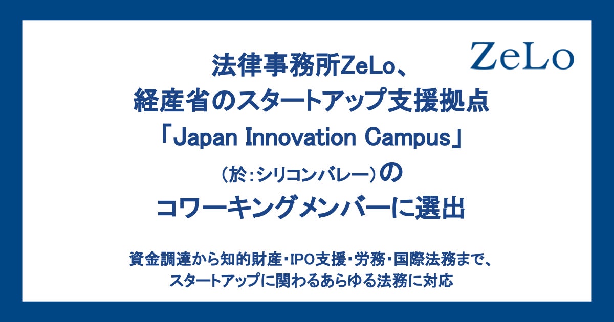法律事務所ZeLo、経産省のスタートアップ支援拠点「Japan Innovation Campus」(於:シリコンバレー)のコワーキングメンバーに選出