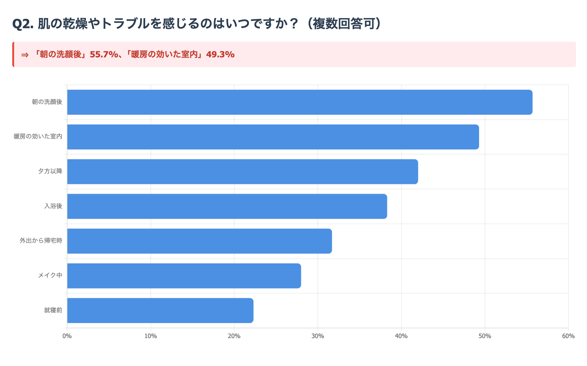その結果、「朝の洗顔後」が55.7%で最も多く、次いで「暖房の効いた室内にいるとき」(49.3%)、「夕方以降」(42.0%)という結果になりました。