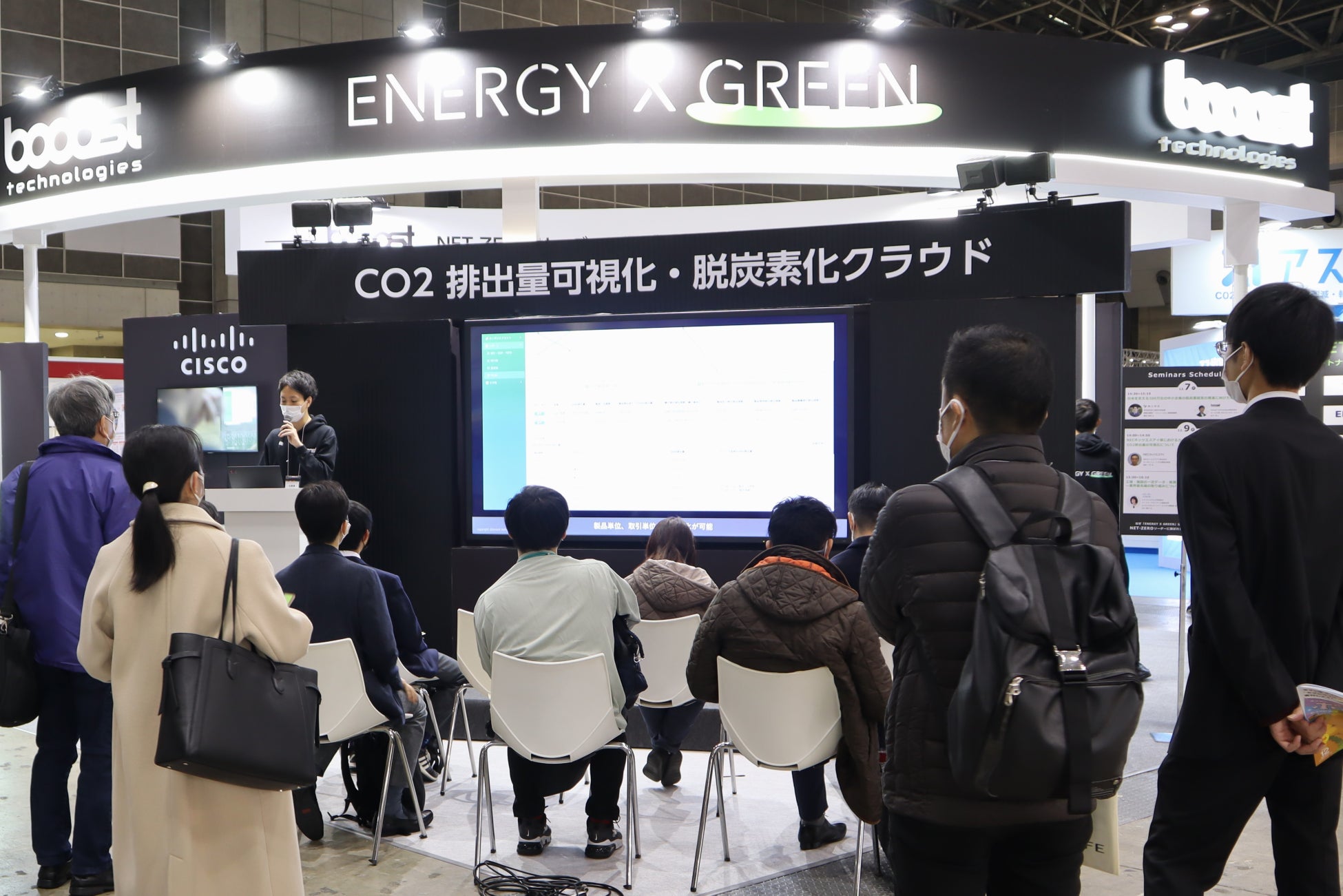 なお当社ブースでは、CO2等排出量の可視化・管理・オフセット・報告が可能なカーボンマネジメントプラットフォーム『ENERGY X GREEN』を展示・パネルやデモで紹介した他、組織の脱炭素化のノウハウや、各業界のNET-ZEROリーダーに『ENERGY X GREEN』が選ばれる理由がわかるセミナーをブース内にて連日開催しました。さらに、シスコとの連携の一環である、工場・施設の一次データ、実測値からCO2等排出量を可視化するサービスの展示エリアを設置し、工場等のセキュリティの厳しい現場の排出量を、削減に繋がる粒度で可視化する取り組みについて、シスコの説明員と共に具体的に紹介しました。