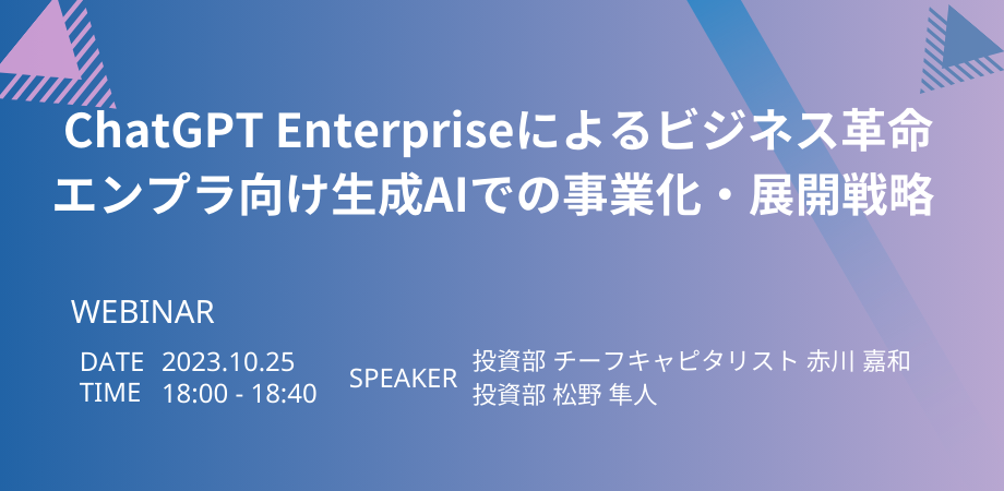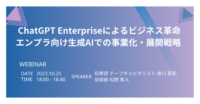 ChatGPT Enterpriseを始めとしたエンタープライズ(以下、エンプラ)向け生成AIサービスと、本領域での事業化、展開戦略について日本最大の累計投資社数を誇るベンチャーキャピタルであるジャフコで長年投資業務に携わってきたチーフキャピタリストの赤川が解説いたします。