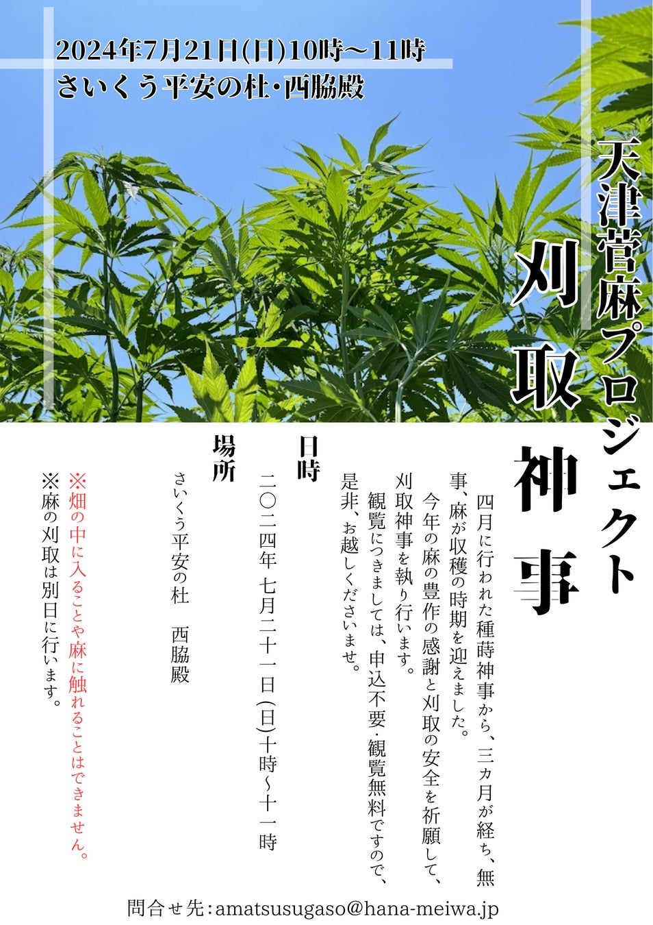 本年度は、青々と育った麻に感謝と他栽培地での豊作を祈願する「刈取神事」をさいくう平安の杜・西脇殿にて執り行います。