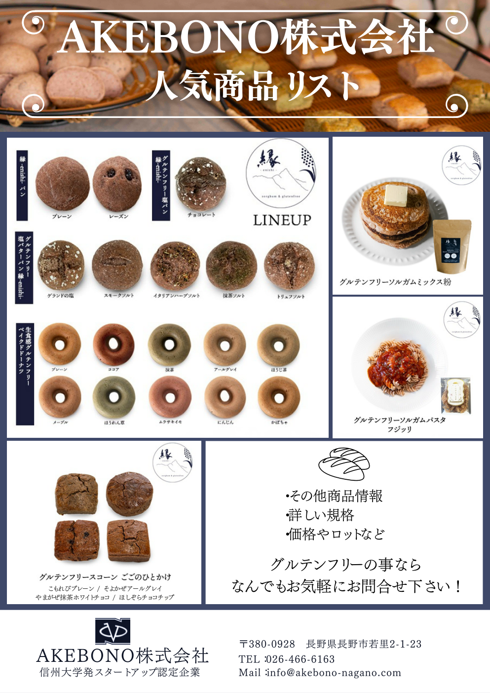 AKEBONO株式会社は、信州大学発スタートアップとして、グルテンフリー・無添加・国産素材に特化した製品を製造しています。 自社ブランド「縁-enishi- sorghum&glutenfree」や「GLUTENFREE JAPAN」を展開し、OEM・D2C・小売を横断する“やさしい食”のプラットフォーム構築を目指しています。 当社は全国創業選手権で中小企業庁長官賞を受賞、信州ベンチャーサミットでグランプリを獲得するなど、その挑戦と成果は高く評価されてきました。 「安心・おいしさ・持続可能性」を理念に掲げ、世界5大穀物の1つである「ソルガム」を活用したグルテンフリー食品の製造・販売、EC事業、OEM事業を展開。自社ブランドやOEM受託製造事業を通じて、誰もが楽しめる新しい食文化を発信していきます。