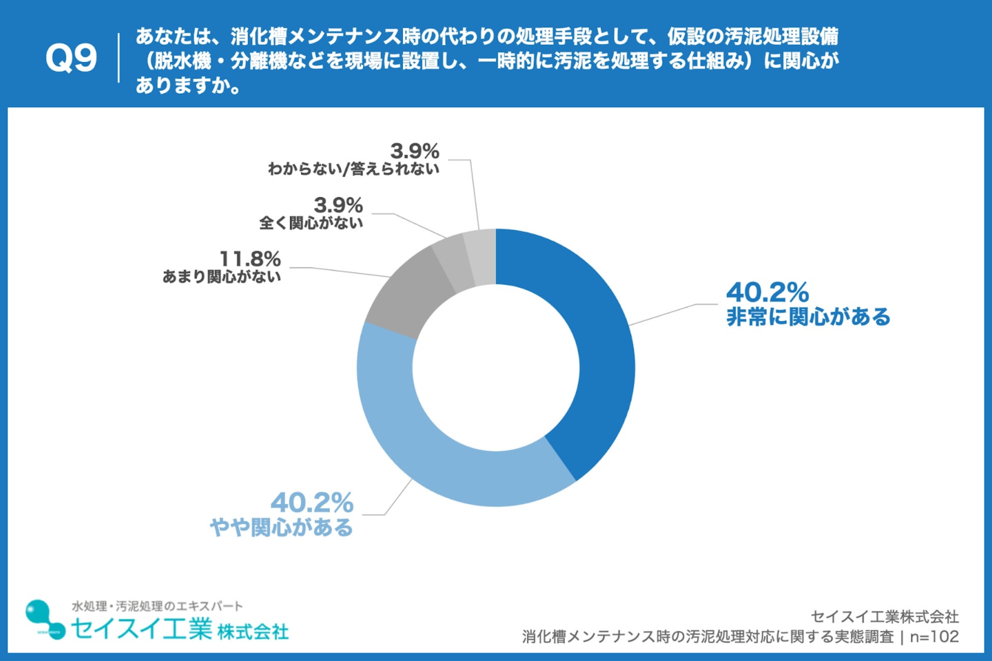 「Q9. あなたは、消化槽メンテナンス時の代わりの処理手段として、仮設の汚泥処理設備(脱水機・分離機などを現場に設置し、一時的に汚泥を処理する仕組み)に関心がありますか。」(n=102)と質問したところ、「非常に関心がある」が40.2%、「やや関心がある」が40.2%という回答となりました。