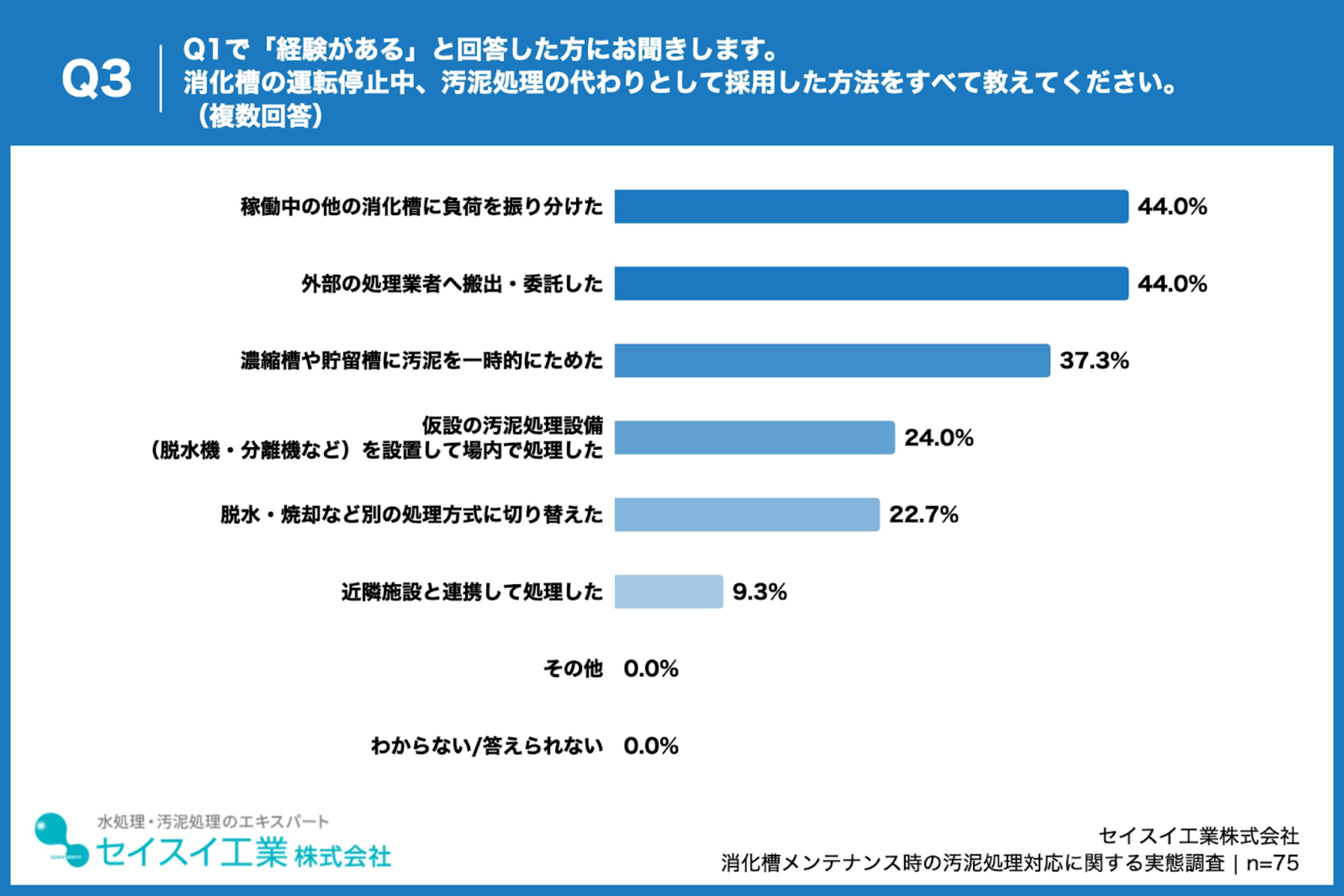 「Q3. Q1で「経験がある」と回答した方にお聞きします。消化槽の運転停止中、汚泥処理の代わりとして採用した方法をすべて教えてください。(複数回答)」(n=75)と質問したところ、「稼働中の他の消化槽に負荷を振り分けた」が44.0%、「外部の処理業者へ搬出・委託した」が44.0%「濃縮槽や貯留槽に汚泥を一時的にためた」が37.3%、という回答となりました。