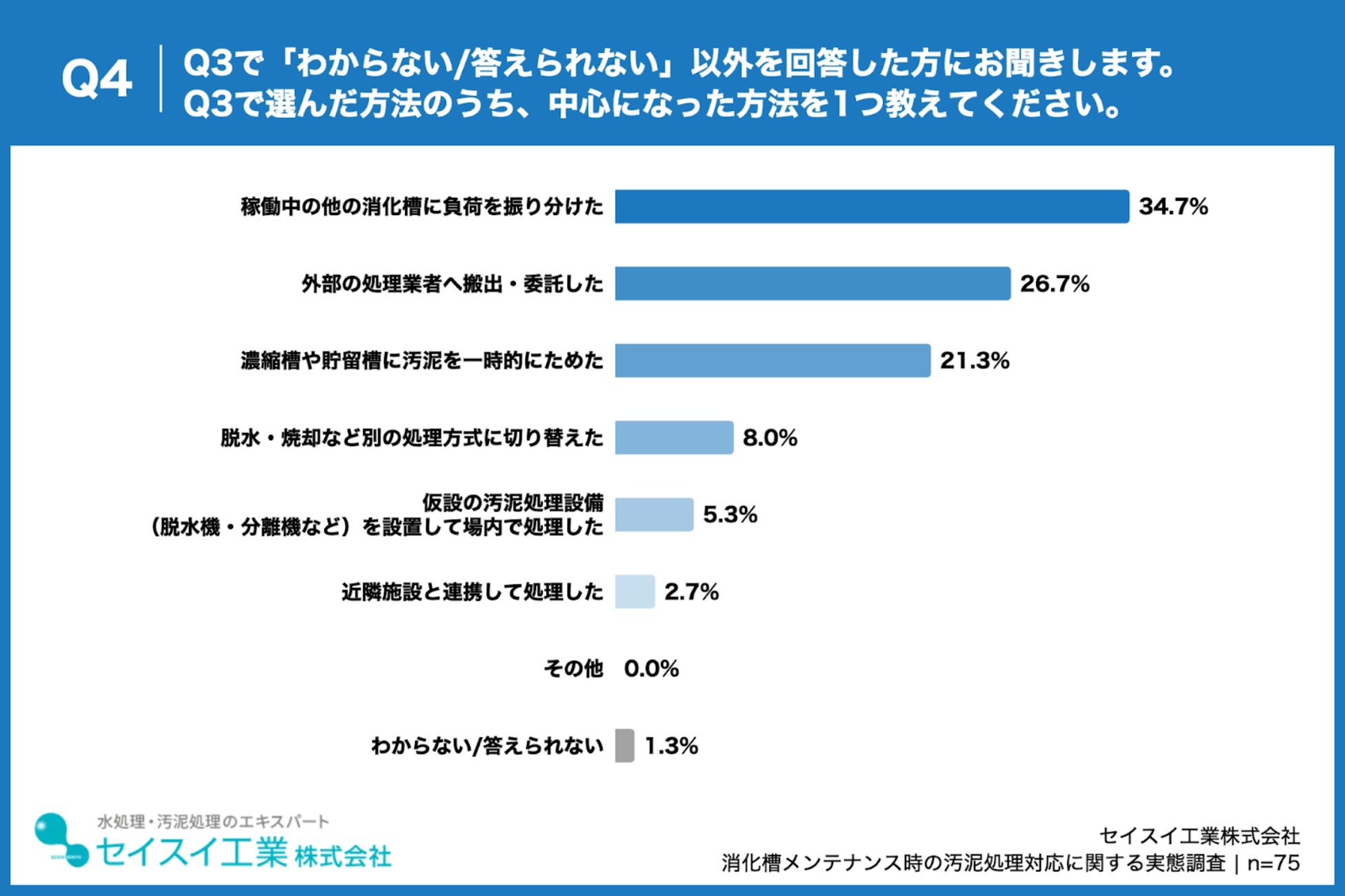「Q4. Q3で「わからない/答えられない」以外を回答した方にお聞きします。Q3で選んだ方法のうち、中心になった方法を1つ教えてください。」(n=75)と質問したところ、「稼働中の他の消化槽に負荷を振り分けた」が34.7%、「外部の処理業者へ搬出・委託した」が26.7%という回答となりました。