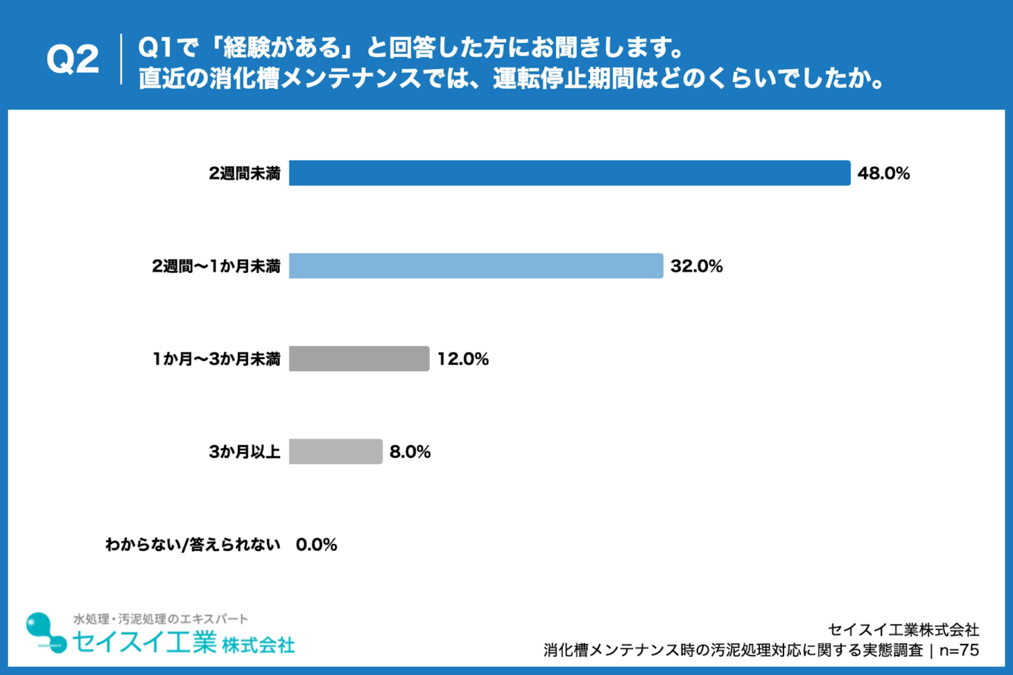 「Q2. Q1で「経験がある」と回答した方にお聞きします。直近の消化槽メンテナンスでは、運転停止期間はどのくらいでしたか。」(n=75)と質問したところ、「2週間未満」が48.0%、「2週間~1か月未満」が32.0%という回答となりました。