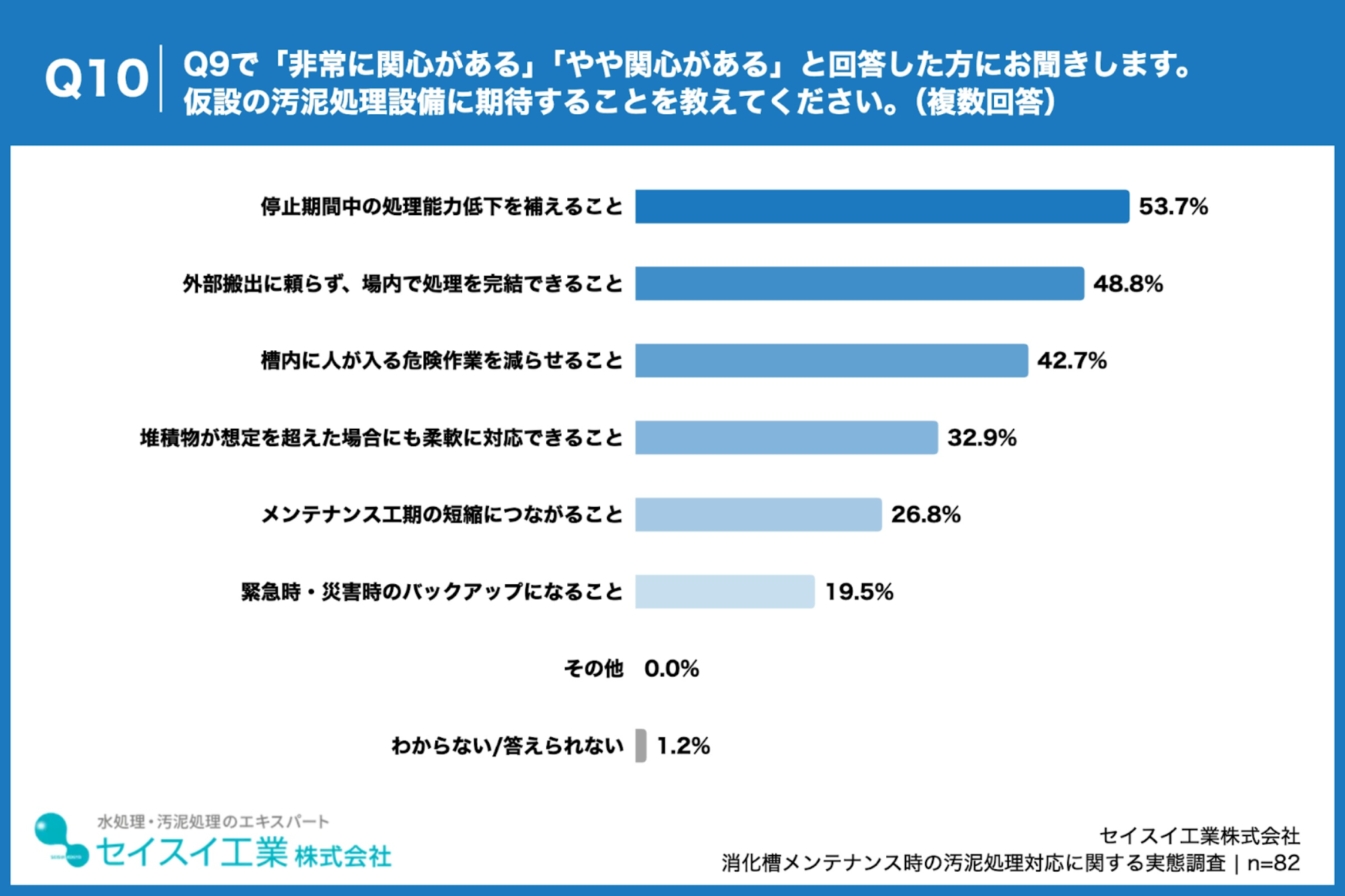 「Q10. Q9で「非常に関心がある」「やや関心がある」と回答した方にお聞きします。仮設の汚泥処理設備に期待することを教えてください。(複数回答)」(n=82)と質問したところ、「停止期間中の処理能力低下を補えること」が53.7%、「外部搬出に頼らず、場内で処理を完結できること」が48.8%、「槽内に人が入る危険作業を減らせること」が42.7%という回答となりました。