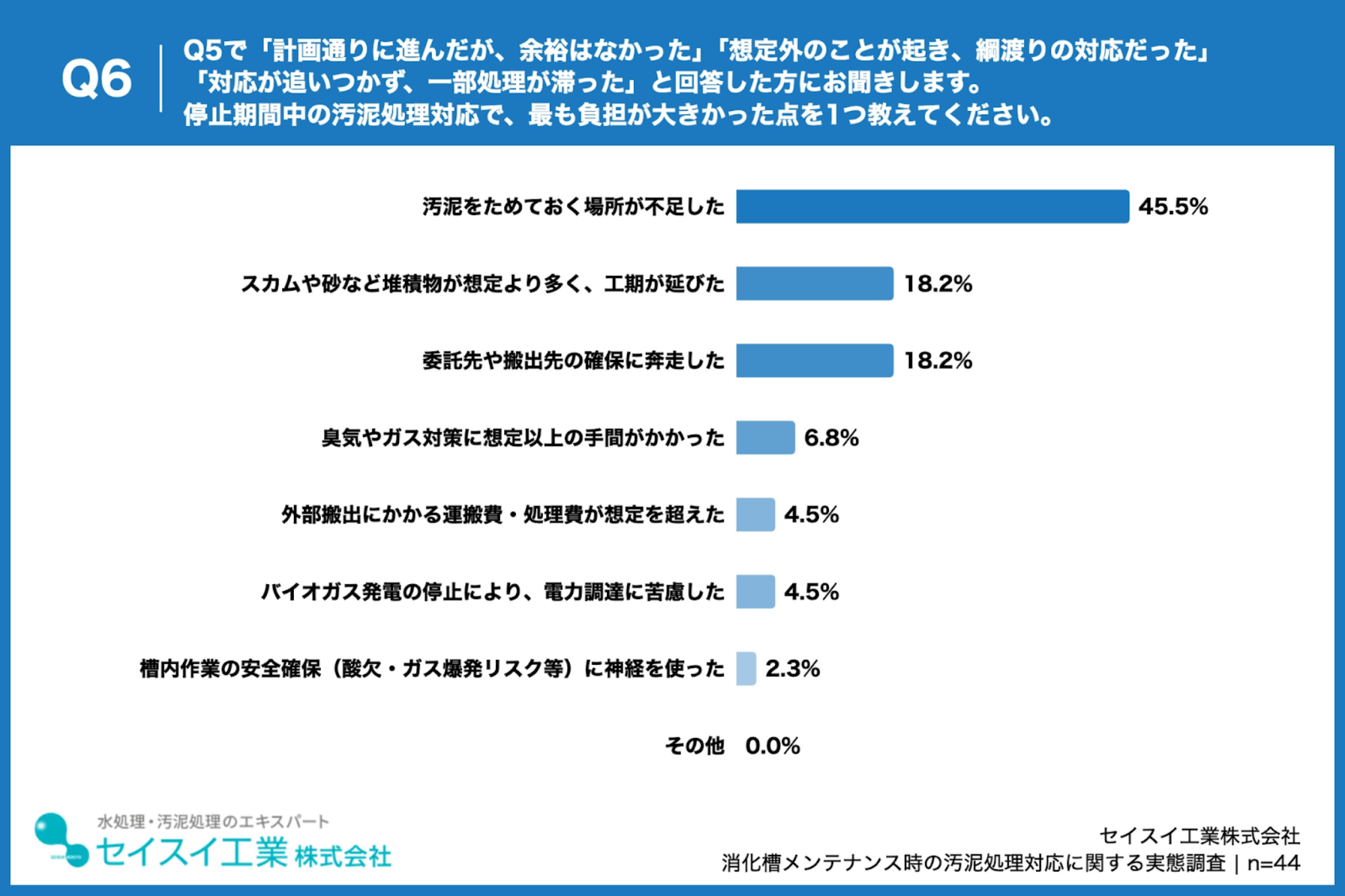 「Q6. Q5で「計画通りに進んだが、余裕はなかった」「想定外のことが起き、綱渡りの対応だった」「対応が追いつかず、一部処理が滞った」と回答した方にお聞きします。停止期間中の汚泥処理対応で、最も負担が大きかった点を1つ教えてください。」(n=44)と質問したところ、「汚泥をためておく場所が不足した」が45.5%、「スカムや砂など堆積物が想定より多く、工期が延びた」が18.2%という回答となりました。