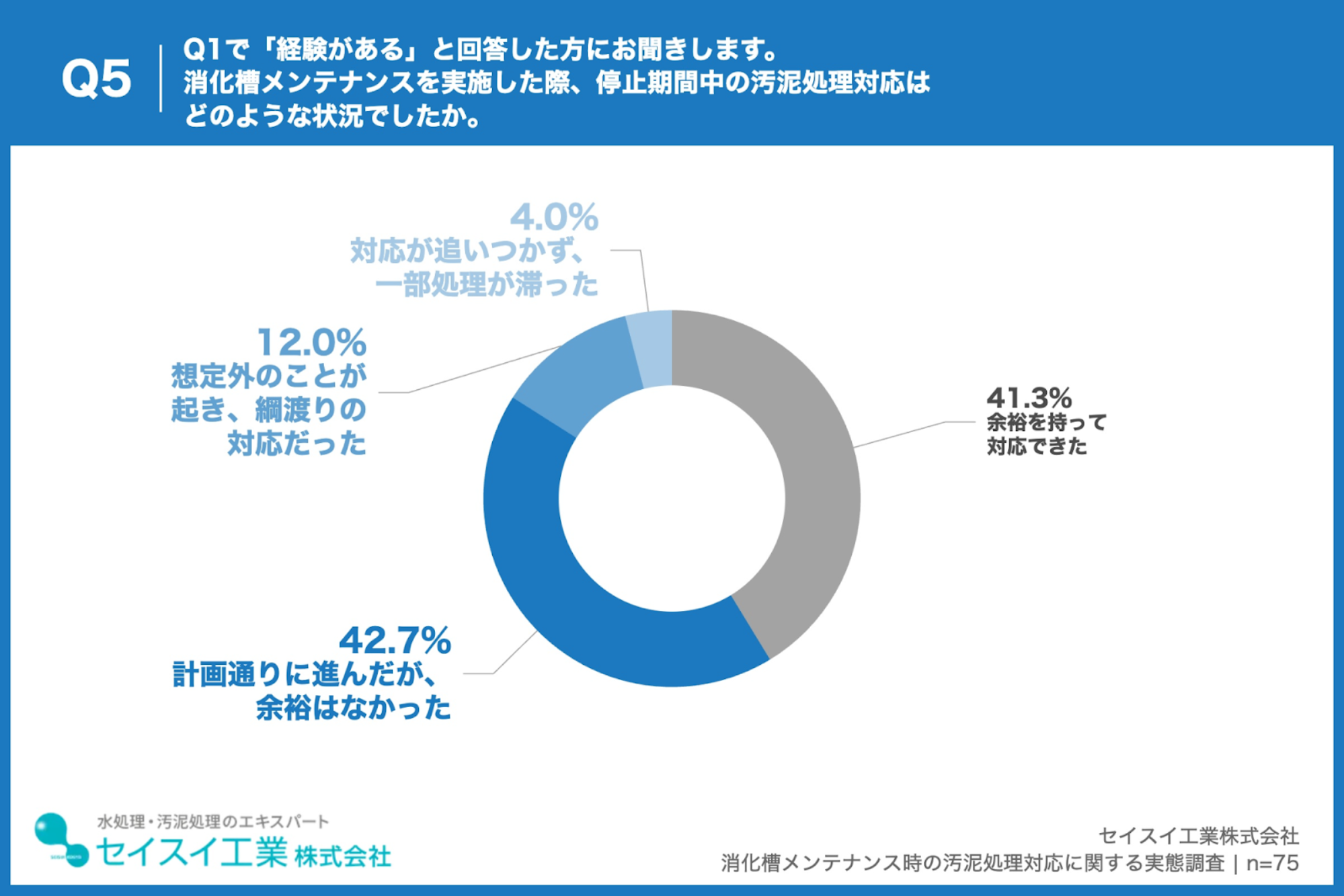 「Q5. Q1で「経験がある」と回答した方にお聞きします。消化槽メンテナンスを実施した際、停止期間中の汚泥処理対応はどのような状況でしたか。」(n=75)と質問したところ、「余裕を持って対応できた」が41.3%、「計画通りに進んだが、余裕はなかった」が42.7%という回答となりました。