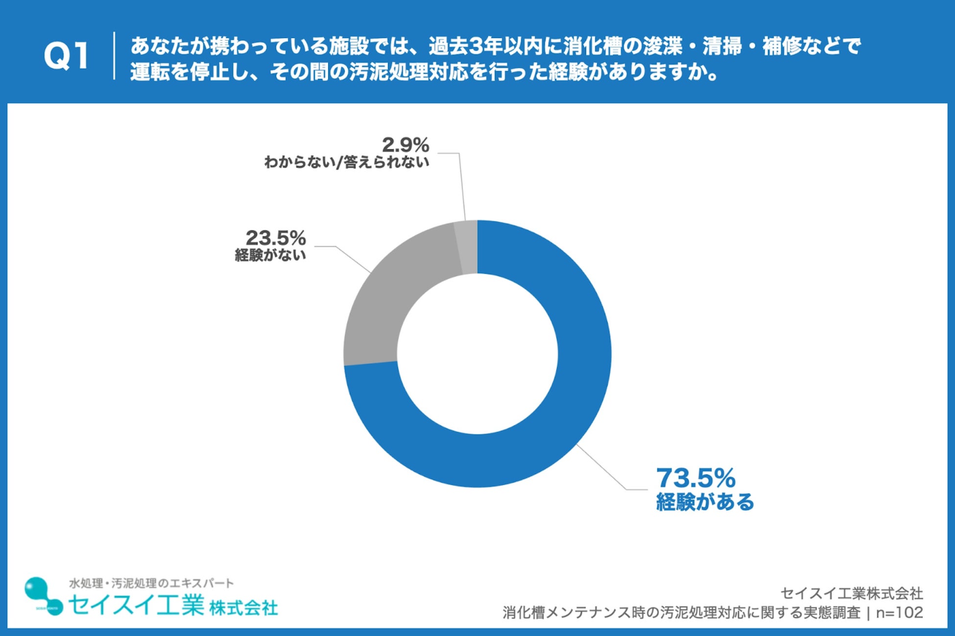「Q1. あなたが携わっている施設では、過去3年以内に消化槽の浚渫・清掃・補修などで運転を停止し、その間の汚泥処理対応を行った経験がありますか。」(n=102)と質問したところ、「経験がある」が73.5%、「経験がない」が23.5%という回答となりました。