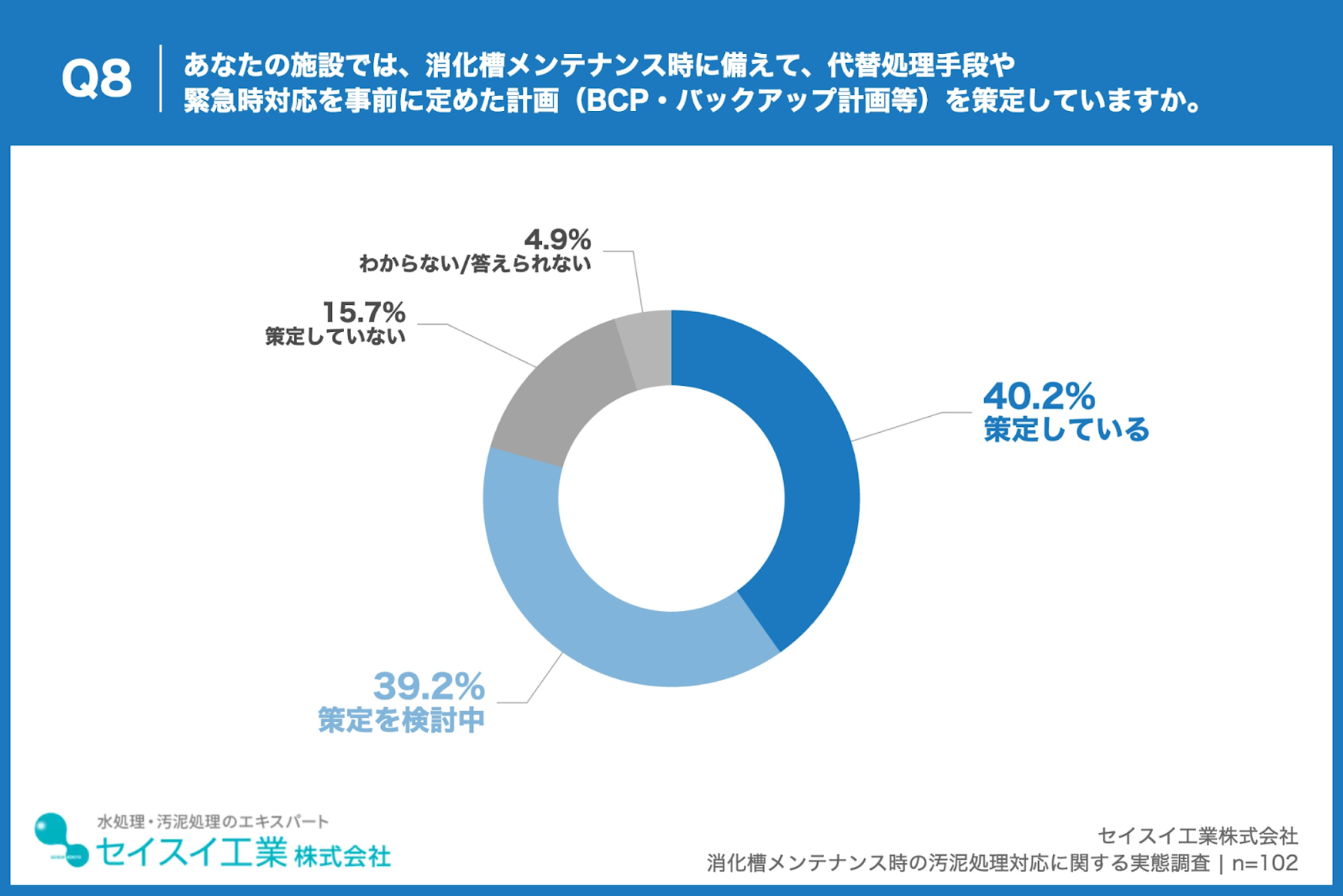 「Q8. あなたの施設では、消化槽メンテナンス時に備えて、代替処理手段や緊急時対応を事前に定めた計画(BCP・バックアップ計画等)を策定していますか。」(n=102)と質問したところ、「策定している」が40.2%、「策定を検討中」が39.2%という回答となりました。