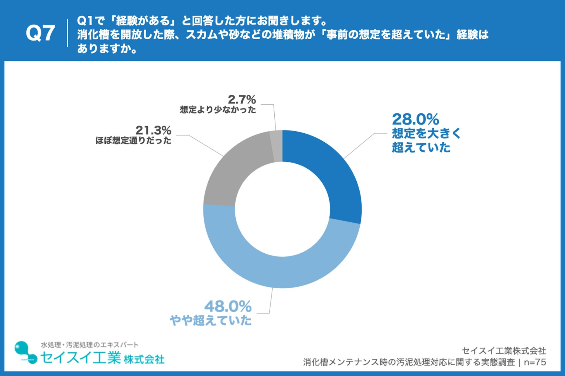 「Q7. Q1で「経験がある」と回答した方にお聞きします。消化槽を開放した際、スカムや砂などの堆積物が「事前の想定を超えていた」経験はありますか。」(n=75)と質問したところ、「想定を大きく超えていた」が28.0%、「やや超えていた」が48.0%という回答となりました。