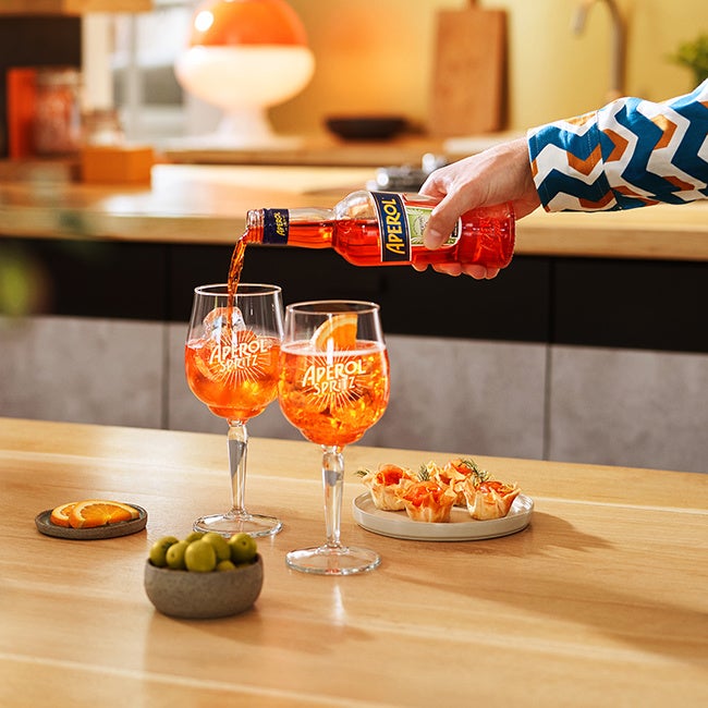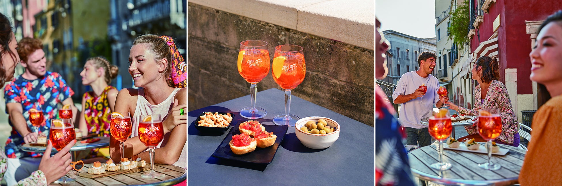 アペロールが生まれたイタリアの⾷習慣として⽋かせない「アペリティーボ」。家族や友人とディナー前の⼣刻から⾷前酒と軽いフードを楽しむスタイルは、現在のイタリアでも⽇常の暮らしの中にしっかりと根付いています。まずは辛口スパークリングワインのプロセッコやアペロールスプリッツなどのイタリアンカクテルで乾杯。軽めのおつまみで家路につく⼈もいれば、レストランメニューを決めながらアペリティーボをしたり、そのままディナーを楽しむ⼈もいたり様々です。