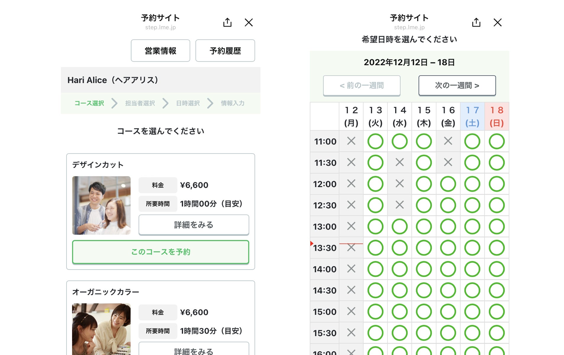予約コースや担当者、希望日時などLINE上で予約の受付を完結させることができます。