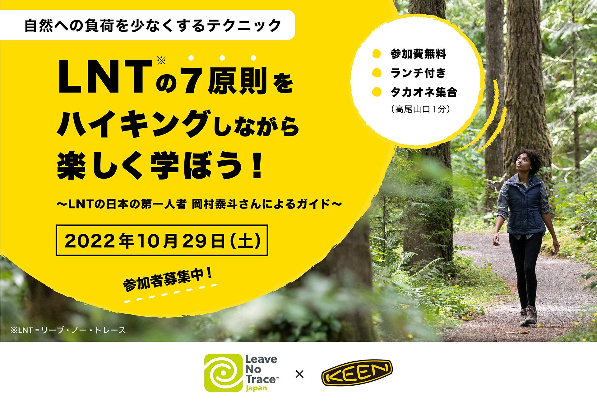 2003年の創業以来、社会貢献を経営の礎とするアウトドア・フットウェアブランド『KEEN(キーン)』(キーン・ジャパン合同会社 東京都港区 代表:竹田尚志)は、環境に対するインパクトを最小限にして、アウトドアを楽しむための環境倫理プログラム [Leave No Trace(リーブ・ノー・トレース)]を学ぶワークショップ <LNTの7原則をハイキングしながら楽しく学ぼう!〜LNTの日本の第一人者 岡村泰斗さんによるガイド〜 >を2022年10月29日(土)、高尾山口駅前活動ホテル「タカオネ」と、高尾山周辺にて開催いたします。