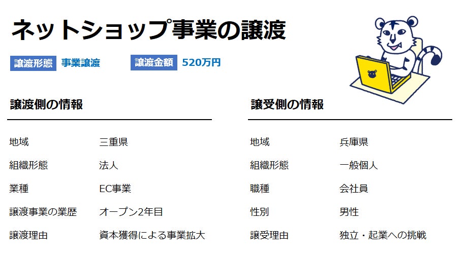 本成約者は、少額の個人M&A実現を目指す希望者に対し、専門家が必要な知識や情報を伝授し、実際の成約まで伴走型で支援する学習プログラム『アントレ事業承継実践プログラム( https://entrenet.jp/jigyosyokei/index.htm )』を受講し、バトンズの公募でマッチングしたネットショップ事業の事業承継へと至りました。