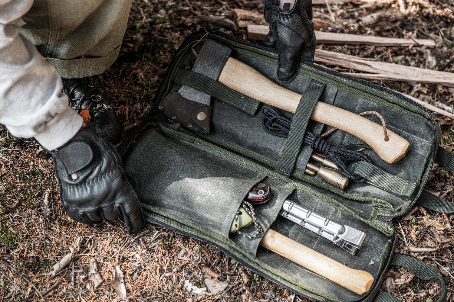 一般的な手斧を面ファスナーでしっかりと固定し、安全に収納・運搬が可能なケース。