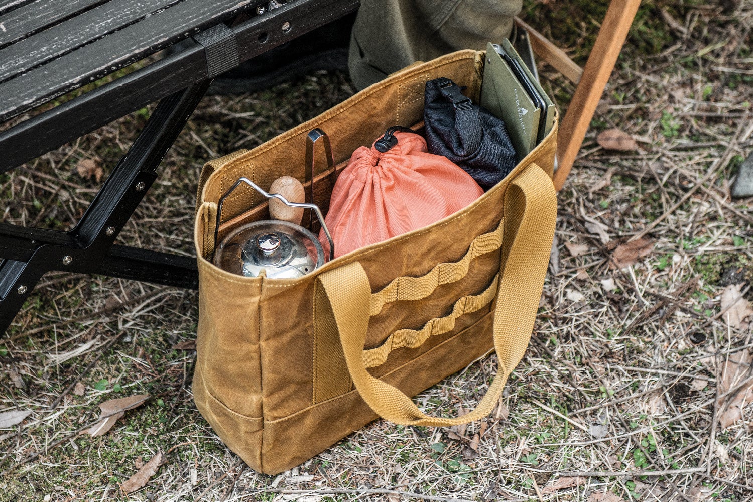 さまざまなキャンプ道具を取り出しやすく収納しやすいトートバッグ。