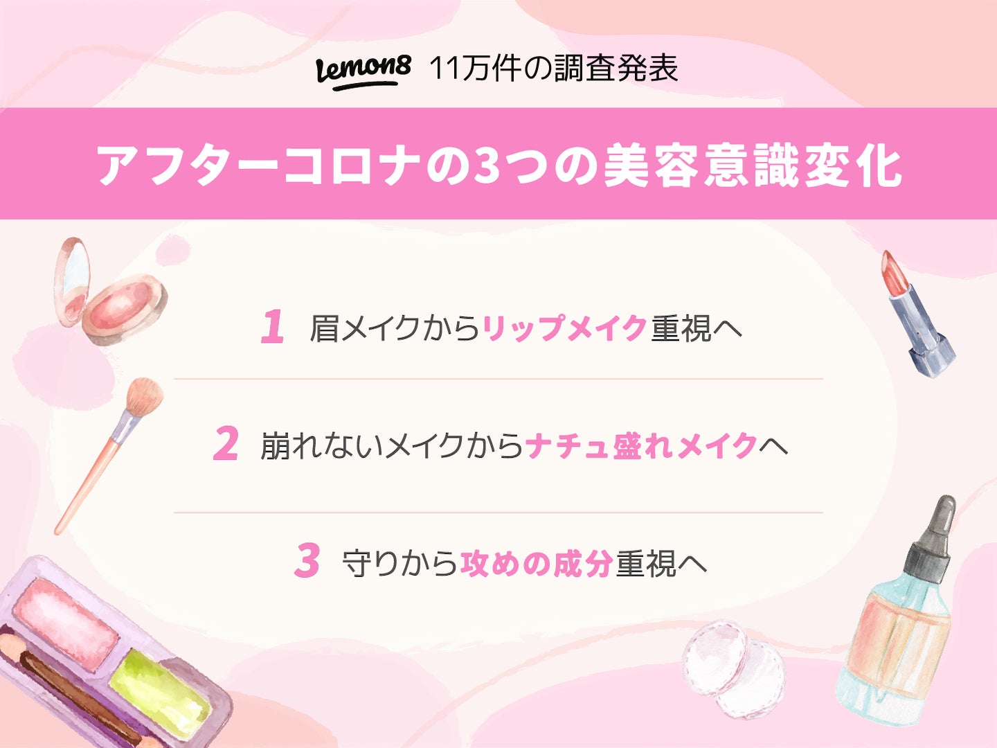 集計方法:Lemon8内で投稿された約11万件の投稿のうち、いいね数、保存数、コメント数、シェア数の変化を基に2021年12月1日から2022年5月31日をコロナ禍、2022年12月1日から2023年5月31日をアフターコロナと位置づけ、「アフターコロナの3つの美容意識変化」と「2023下半期美容トレンド3選」を選定したもの。
