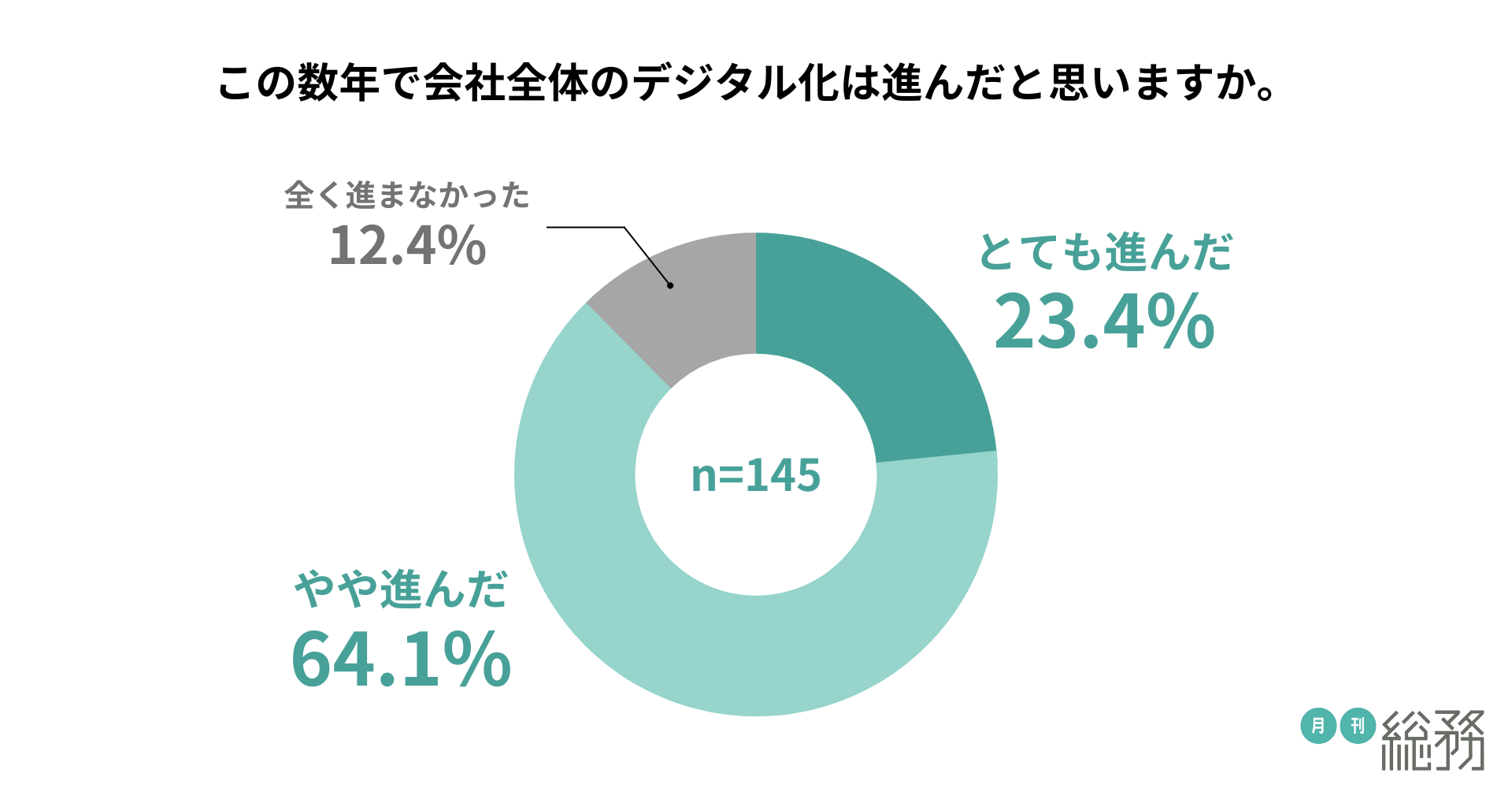 この数年で会社全体のデジタル化が進んだと思うか尋ねたところ、8割以上が進んだと回答しました(n=145)。