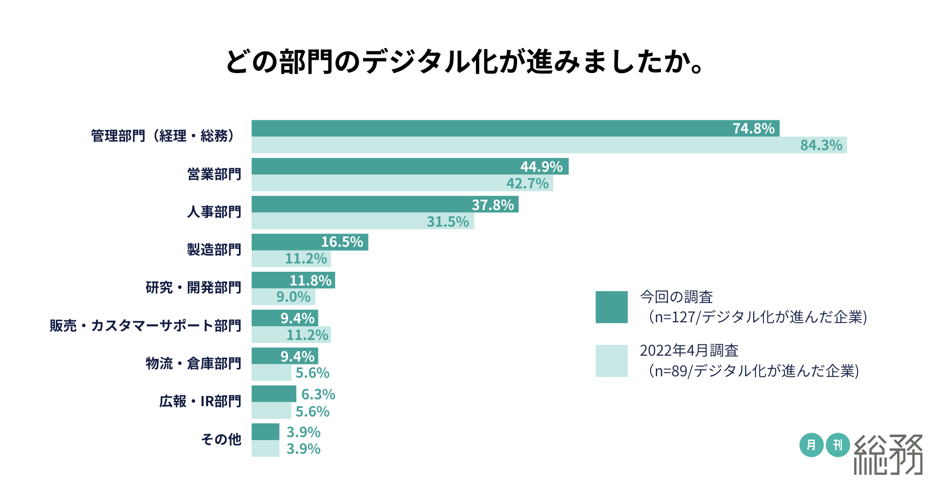 デジタル化が進んだと回答した企業に対し、どの部門のデジタル化が進んだか尋ねたところ、「管理部門(経理・総務)」が74.8%で最多となりました。(n=127/デジタル化が進んだと回答した企業)