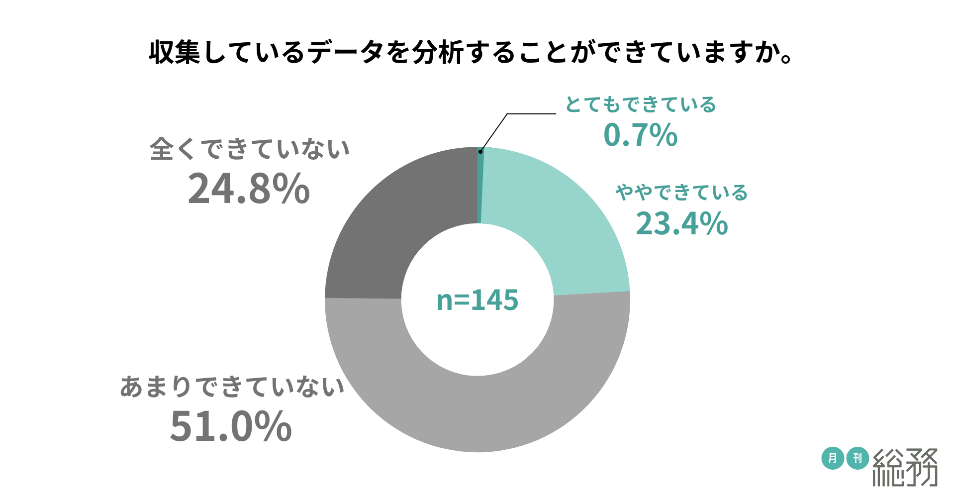 収集しているデータを分析することができているか尋ねたところ、「とてもできている」は0.7%にとどまり、7割以上ができていないと回答しました(n=145)。
