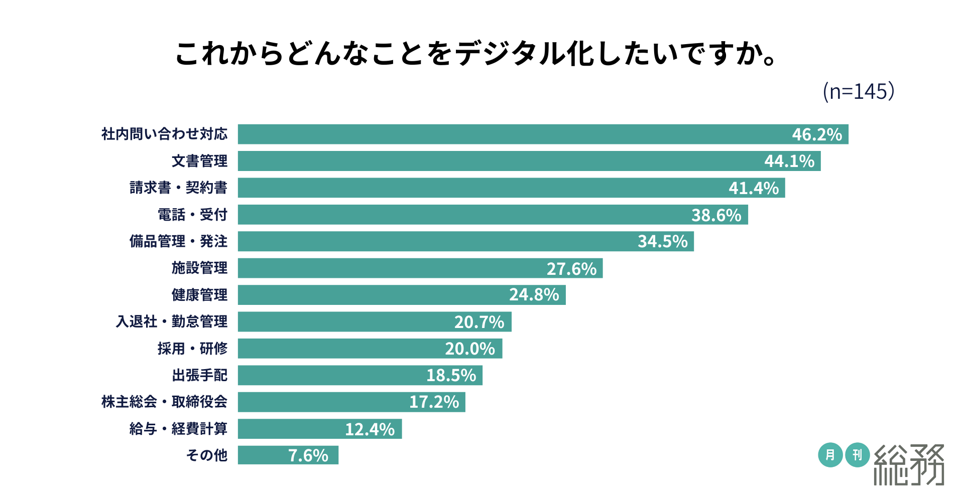 これからデジタル化したいことについて尋ねたところ、「社内問い合わせ対応」が46.2%でもっとも多く、「文書管理」が44.1%、「請求書・契約書」が41.1%と続きました(n=145)。