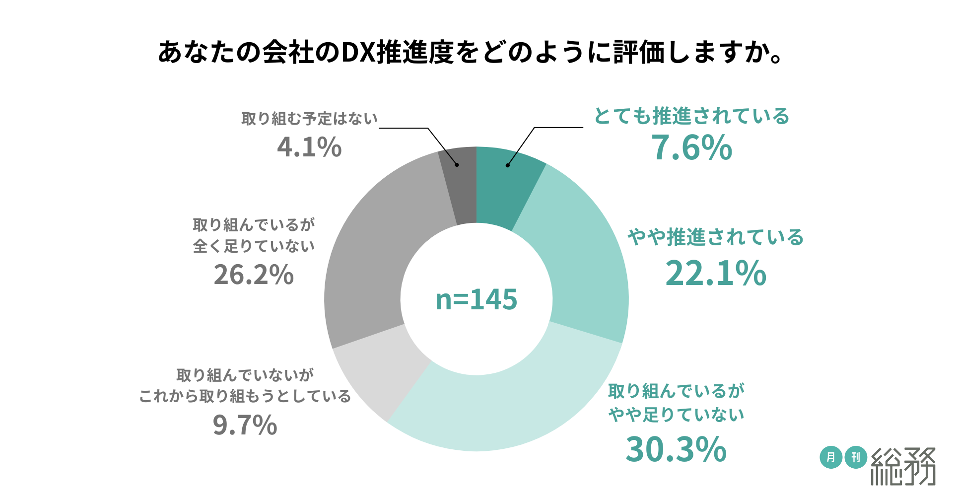 自社のDX推進度をどのように評価するか尋ねたところ、推進されているとの回答は約3割にとどまりました(n=145)。