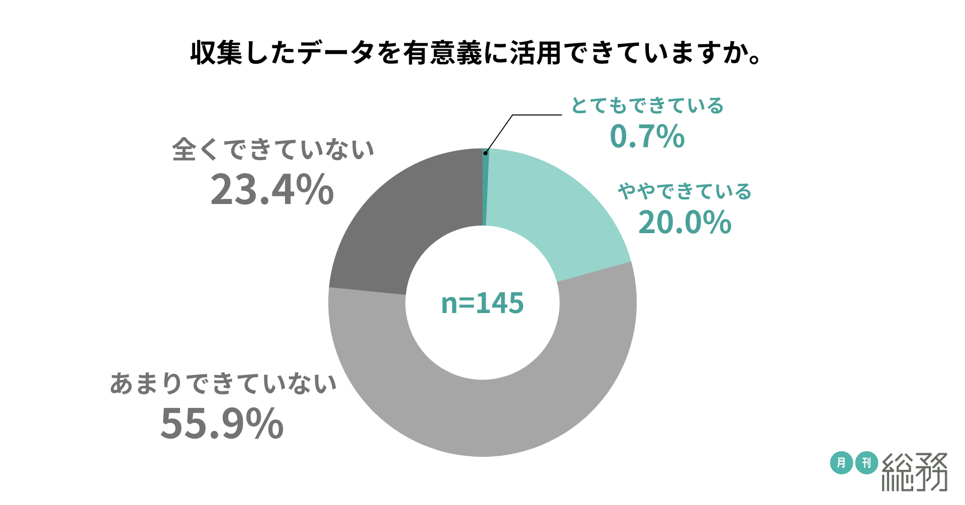 収集しているデータを有意義に活用できているか尋ねたところ、データ分析と同様に「とてもできている」の回答は0.7%にとどまり、約8割ができていないと回答しました。(n=145)。