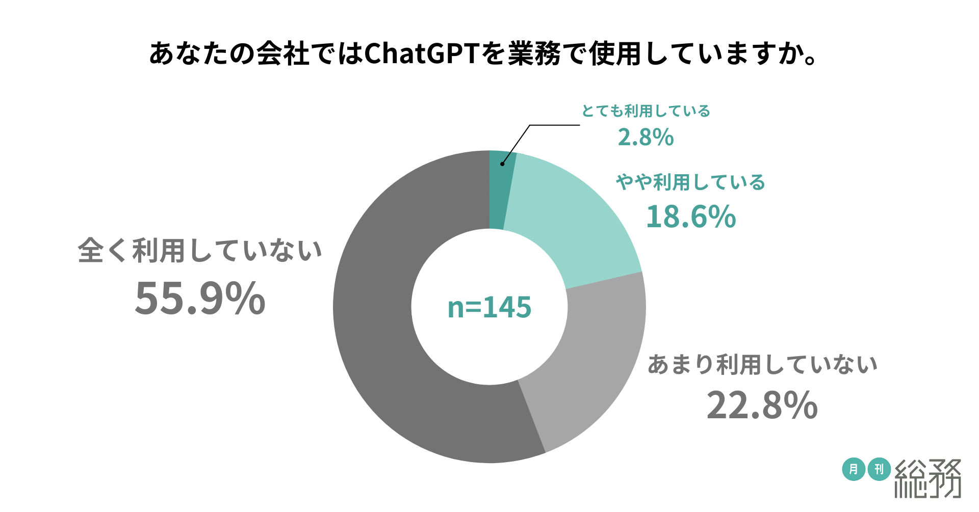自社の業務でChatGPTを使用しているか尋ねたところ、使用しているのは約2割にとどまりました(n=145)。