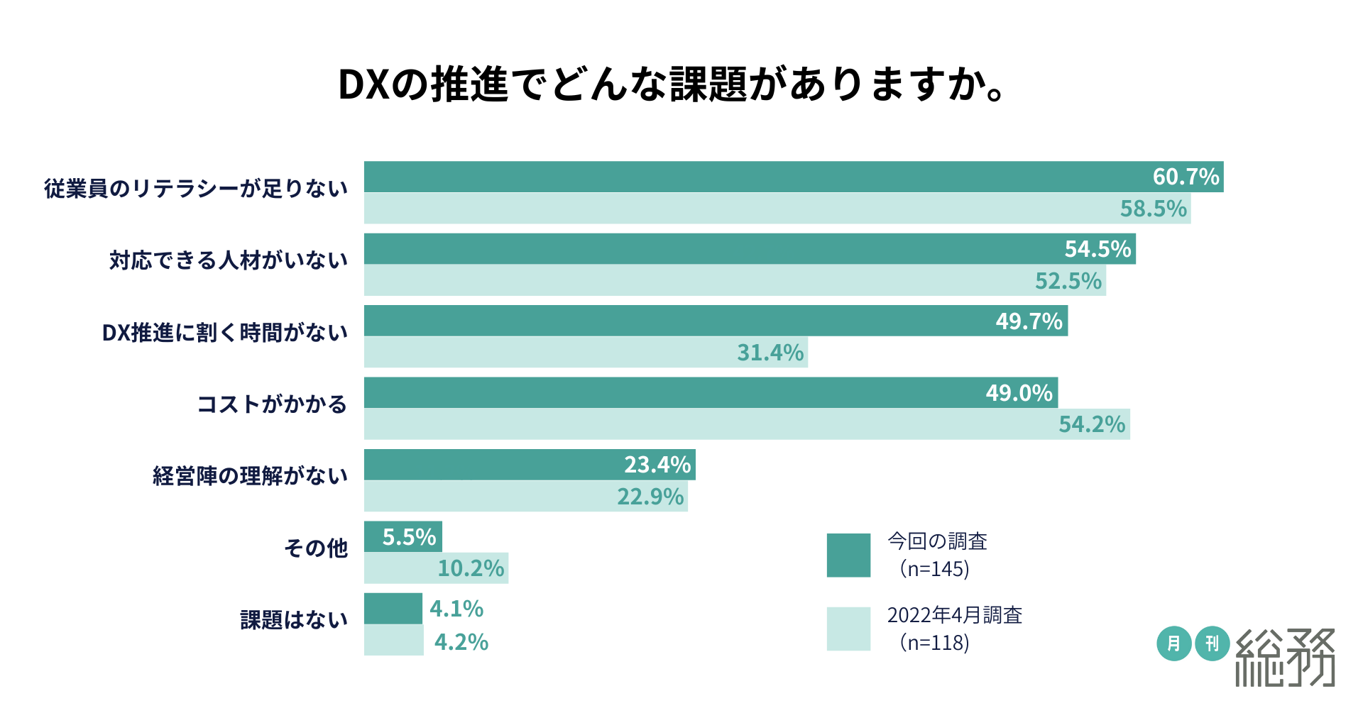 DX推進における課題について尋ねたところ、「従業員のリテラシーが足りない」が60.7%で最も多く、「対応できる人材がいない」が54.5%と続き、人的課題が多いことがわかりました(n=145)。