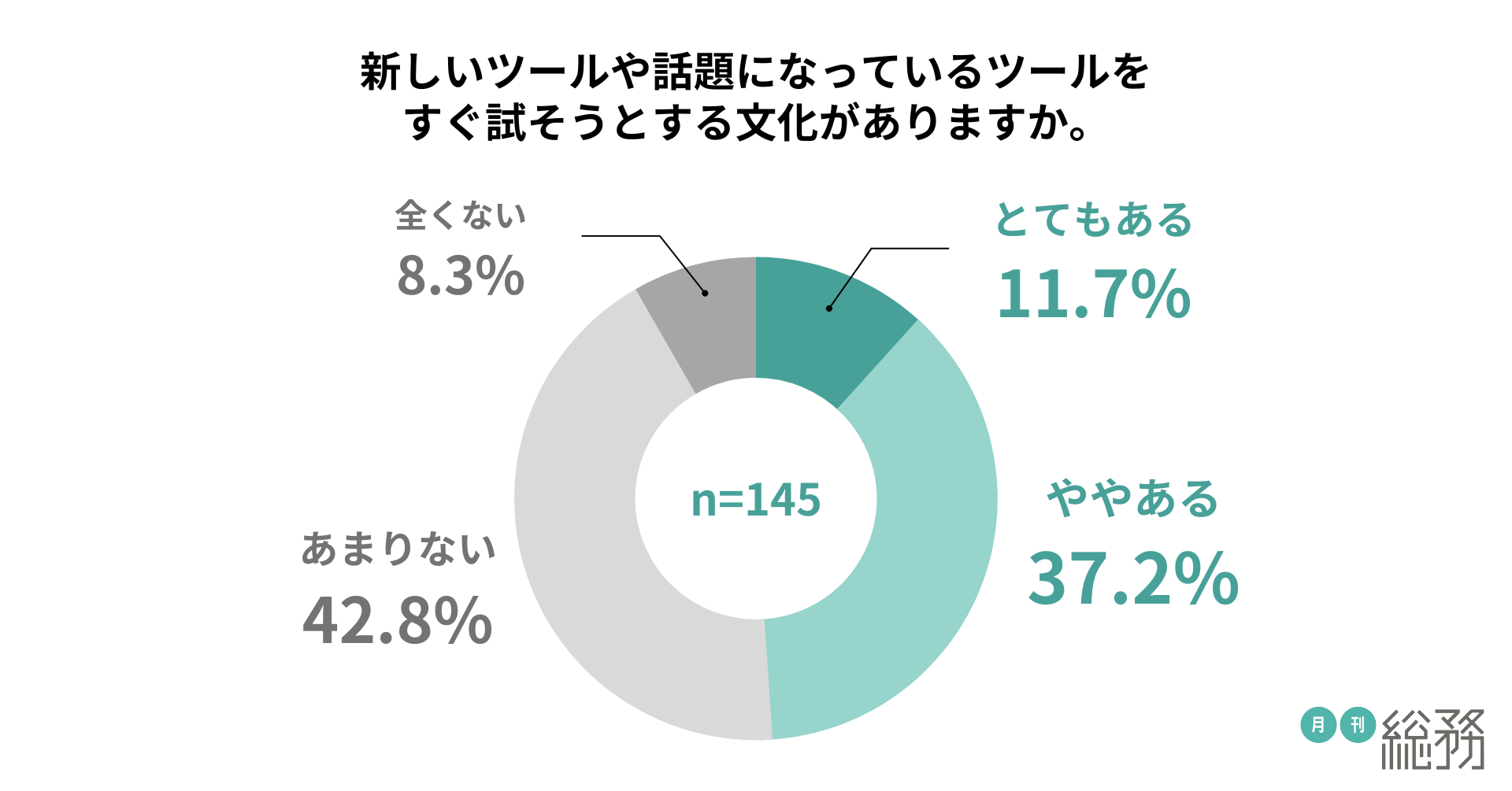 新しいツールや話題になっているツールをすぐ試そうという文化があるか尋ねたところ、約半数があると回答しました(n=145)。