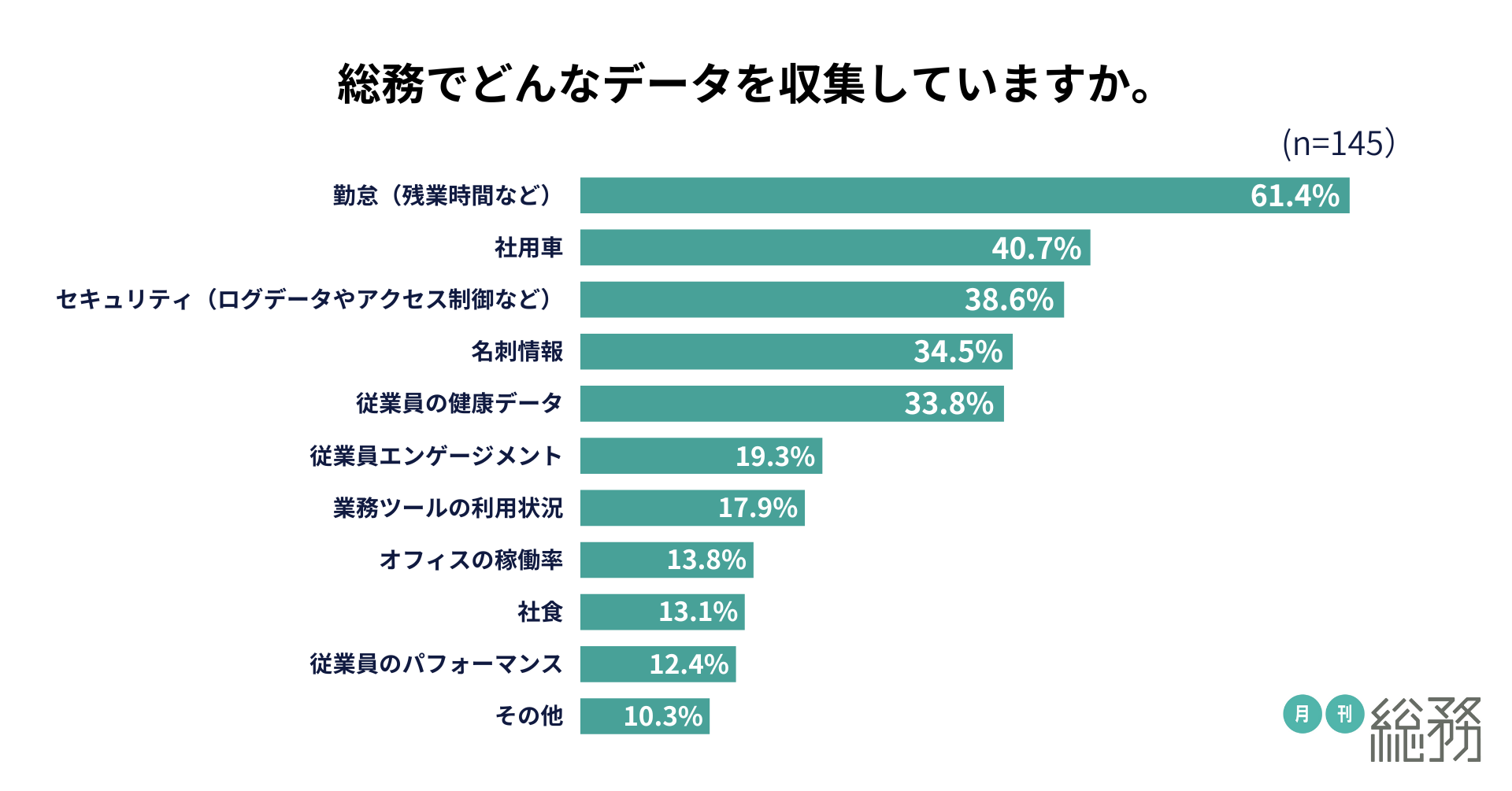 総務で収集しているデータについて尋ねたところ、「勤怠」が61.4%でもっとも多く、「社用車」が40.7%、セキュリティが38.6%と続きました(n=145)。