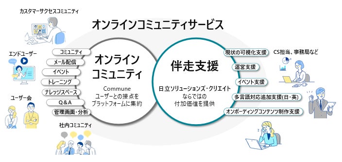 本サービスでは、コミューン株式会社*1の「Commune」のコミュニティサクセスプラットフォームや分析サービスなどの関連サービスを採用し、プラットフォームの導入からコミュニティの運営までを日立ソリューションズ・クリエイトのコミュニティデザイナーが伴走します。これにより、お客さまの業務プロセスに合わせた的確な導入・分かりやすいコンテンツ作り・適切な運営をワンストップで支援し、カスタマーエクスペリエンス(CX)の向上を通じ、カスタマーサクセスの実現をめざします。