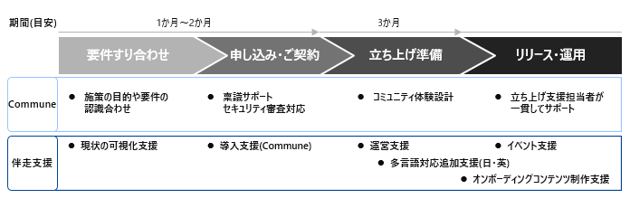 本サービスの導入にあたっては、企業のカスタマーサクセス担当者へのヒアリングを通じて、現状業務のプロセスや課題などを整理・可視化し、多言語対応や最適なイベントを実施するなど、企業とエンドユーザー双方にとって使いやすいコミュニティを実装します。特に現状業務の可視化では、日々の業務に追われがちなカスタマーサクセス担当者を交えたワークショップやヒアリングを通して、「現状分析」をお手伝いします。これにより、お客さまのコミュニティ導入および運営をより効果的なものにします。